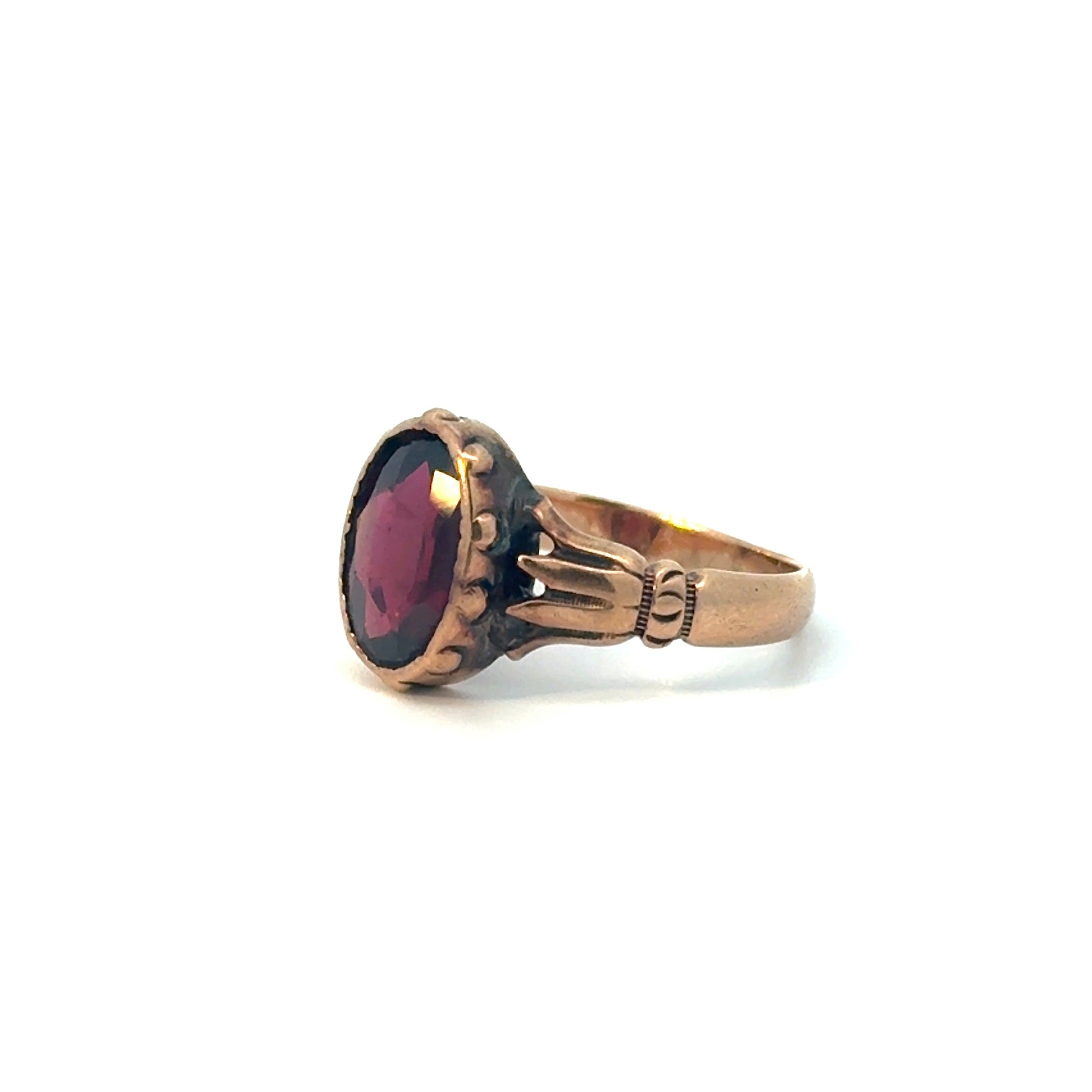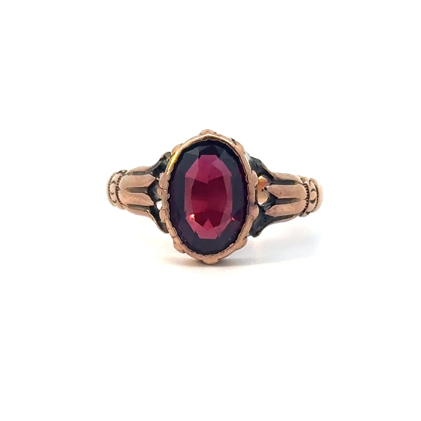 Victorian garnet ring in 10k rose gold. The cranberry-red oval garnet is bezel set and adorned with beading. The shoulders of the ring feature petal-like details and engraving. This ring is in very good antique condition with signs of wear and oxidation, expected with its age. This is such an incredibly lovely ring.