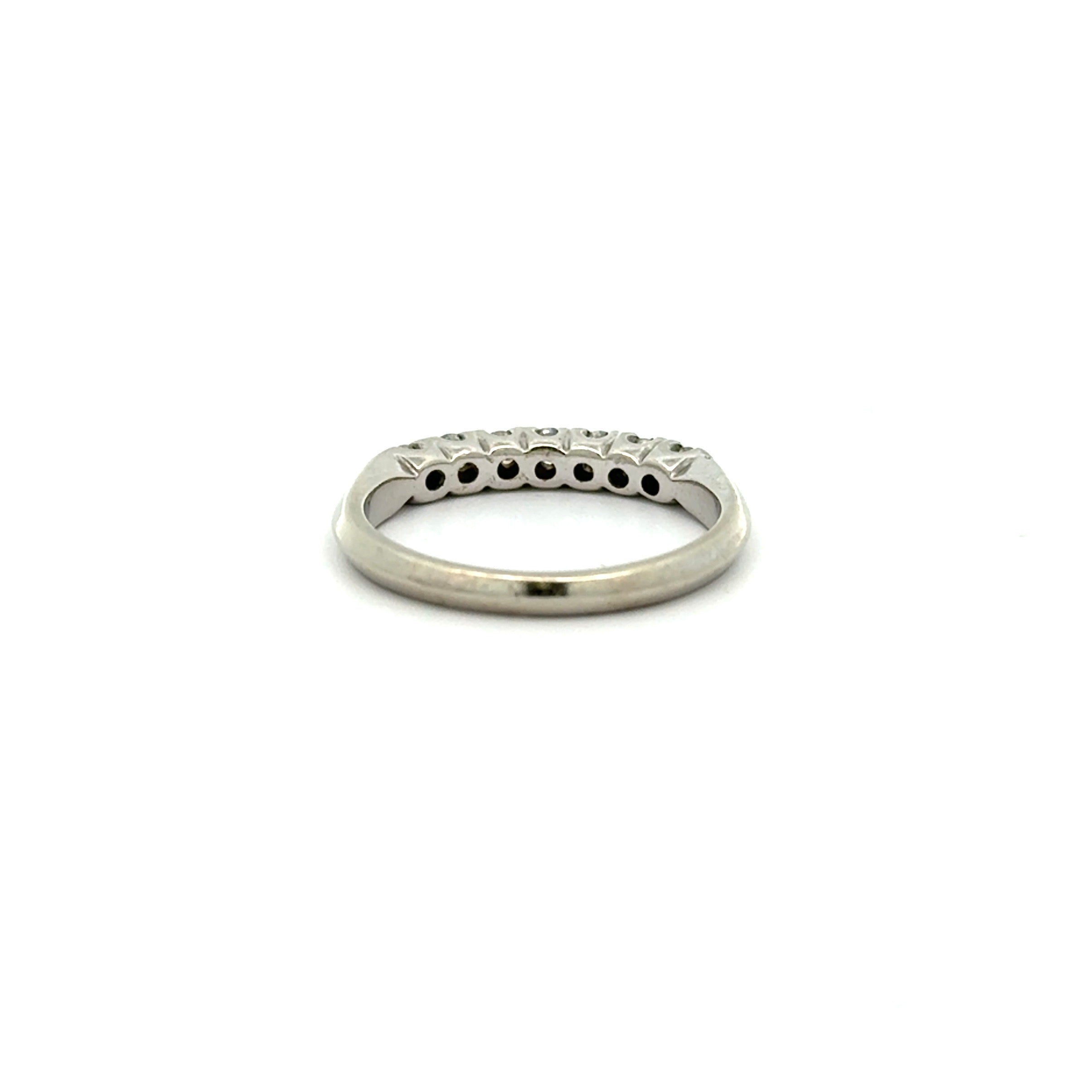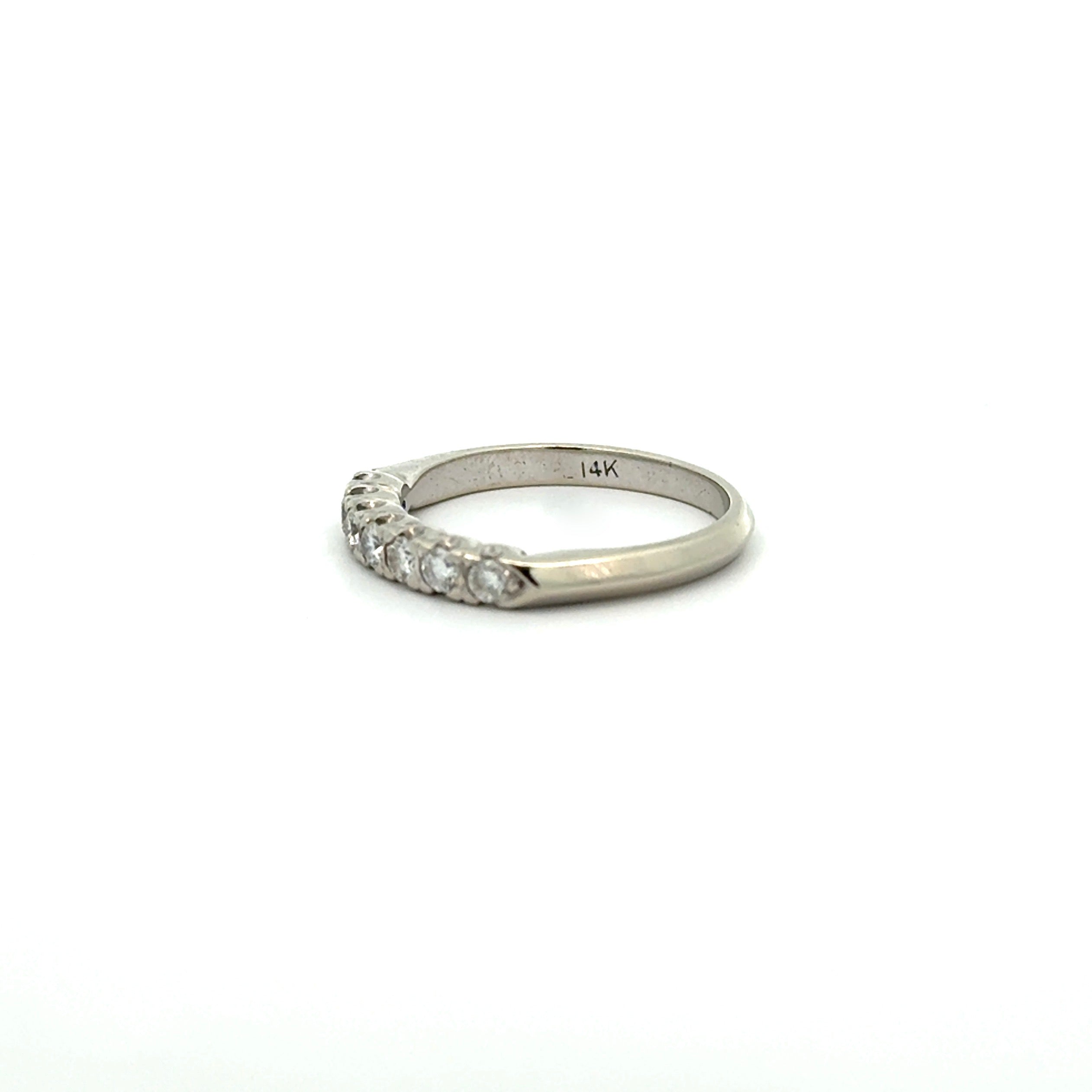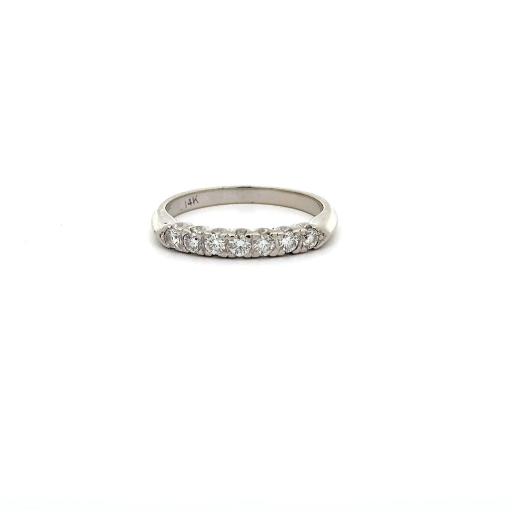 Classic, vintage diamond band in 14k white gold. This timeless ring displays seven Round Brilliant cut diamonds, totaling 0.25ctw, and a soft knife edge shank. This ring is in very good vintage condition with some minor scuffing. It would look fantastic alone or paired with a vintage engagement ring.