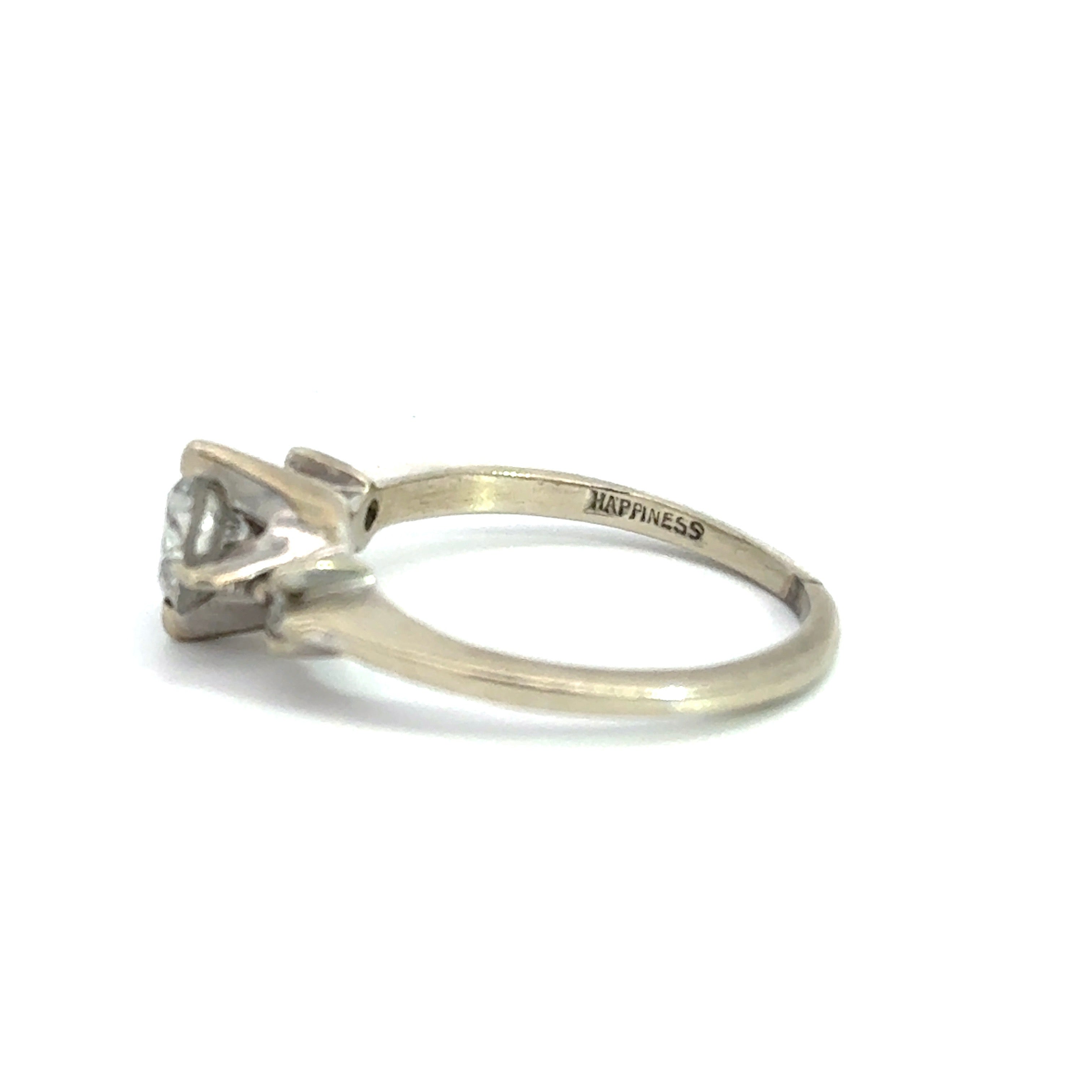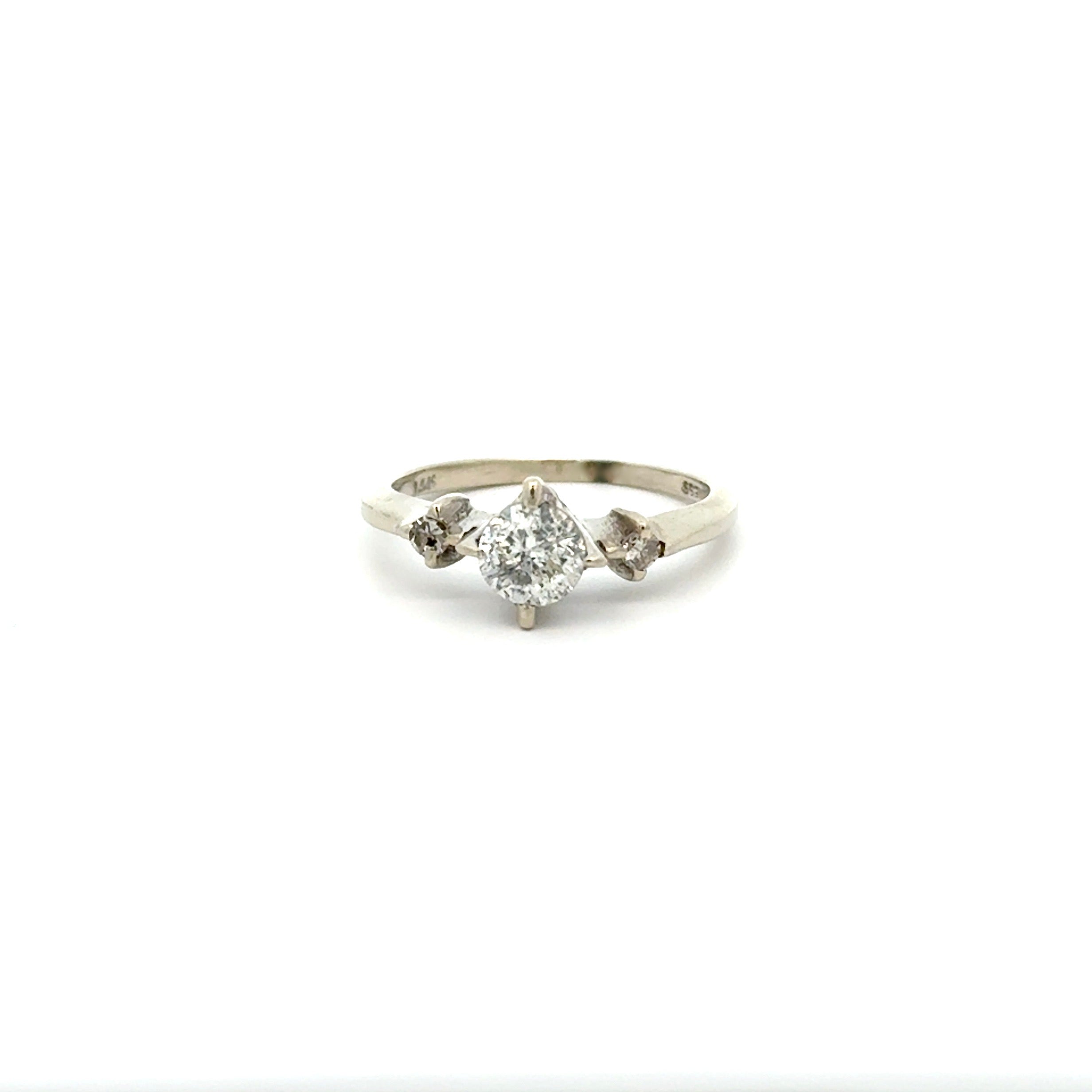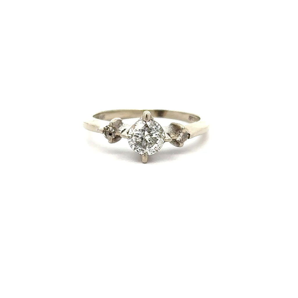 Beautiful mid-century 0.52ctw diamond engagement ring set in 14k white gold. The Happiness brand, hallmarked to the interior of the band, provided expertly crafted bridal jewelry from Swiss jewelry manufacturer Meister. The compass setting of each of the three diamonds provides a unique look on the hand. This ring is in very good vintage condition with minor wear and signs of resizing. This ring would pair beautifully with a diamond band and would make a fantastic vintage engagement ring.
